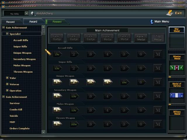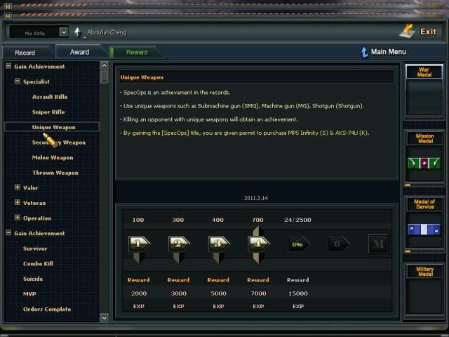 korang bole check berapa kill yang diperlukan dengan klik kat section yang berkenaan. contoh dibawah adalah bagi section UNIQUE WEAPON.