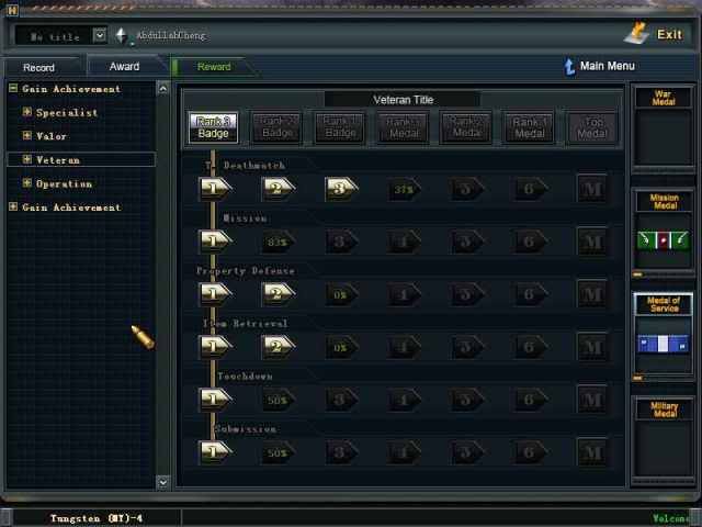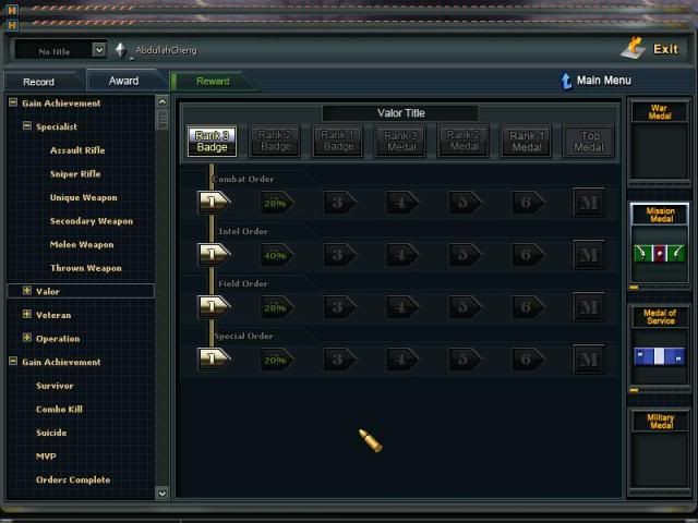 okeh. mcm ni rupa dia. kalau korang tengok kat situ, ada 4 baris - SPECIALIST, VALOR, VETERAN, dan OPERATION. dan kalau korang tengok kat atas sekali tu, ada tulis MAJOR, LT COLONEL, COLONEL, BRIGADIER GENERAL, MAJOR GENERAL, LT GENERAL, dan GENERAL*.